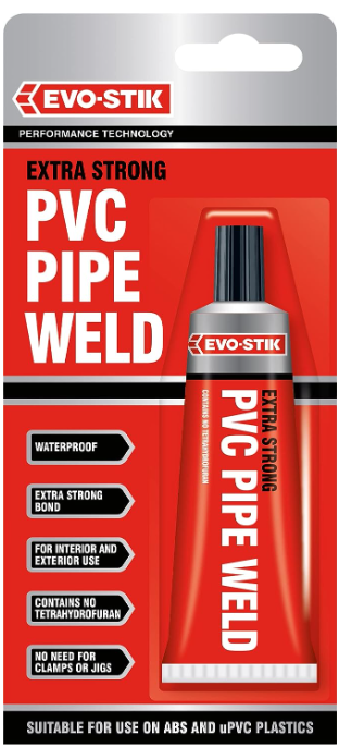 Contents: 1x EVO-STIK PVC Pipe Weld, Extra Strong, For ABS and uPVC Plastics, Waterproof, Interior and Exterior Use, 50ml