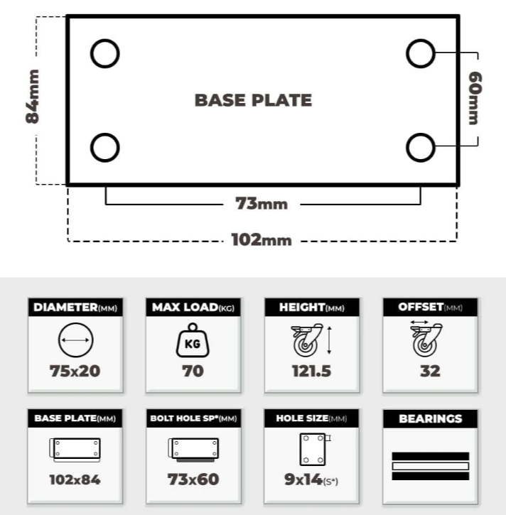 Nickel plated pressed steel componentry with steel core centred, grey coloured thermoplastic rubber wheels with quality roller bearings.