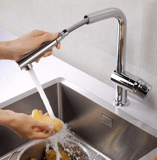 The Grohe Flair kitchen tap offers control and ultimate flexibility in a stylish, easy to use package, designed to fit alongside any sink or kitchen design. Featuring an L-shaped swivelling spout that can turn a full 360°, cleaning the sink or filling pots has never been more convenient. The pull out tap head adds to the versatility of the Grohe Flair mixer tap with EasyDock technology that guarantees easy retraction and smooth docking back to the starting position. The ergonomic single lever of the Grohe Flair kitchen mixer tap moves extremely smoothly thanks to the SilkMove technology, and delivers gradual and precise control of the water flow and temperature. Features the Grohe Starlight scratch resistant finish to guarantee a long tap life.