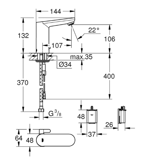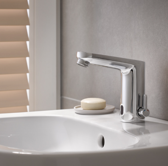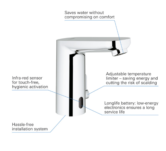 The Grohe Get E infrared electronic basin mixer features a mixing device and adjustable temperature limiter, and an infrared sensor for bi-directional communication for monitoring, configuration and servicing. The sensor controlled Grohe Get basin mixer tap provides a hygienic, hands free system for a great addition to any modern bathroom. The Grohe Get sensor basin tap is WRAS approved, with a durable chrome finish that complements the brass construction.