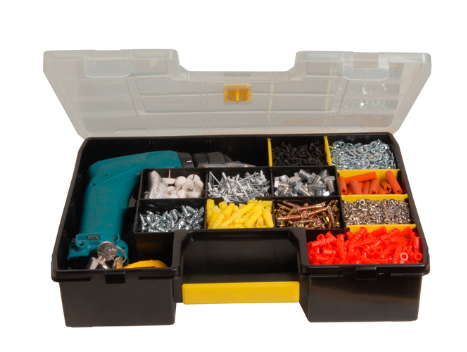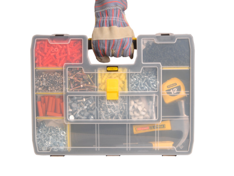 90° compartments provide easy storage. Customisable dividers allow combination of tools and small parts storage (up to 1024 configurations). Top lid lock keeps content secure inside. Side clips allow multiple organisers to be clipped together. Angled corners accommodate angled tools such as hammers.