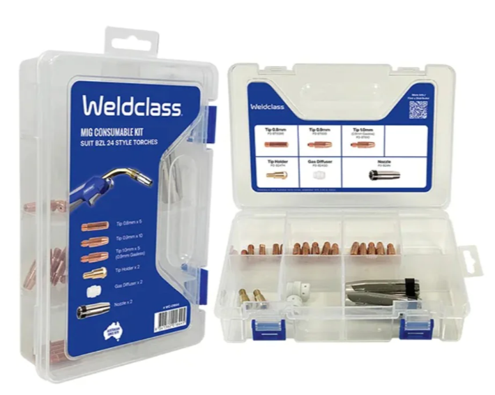 Binzel 24 style MIG welding torches and consumable/spare parts. Now available with 7-year warranty. Manufactured with premium raw materials, no quality short-cuts. Torches are designed in Europe, with ‘hidden’ details like cable quality and crimp fitting design taken care of, to ensure reliability and long service life. Maximum capacity 240 amps, commonly used for light-to-medium fabrication. All torches fitted with ‘Euro’ connection to suit most MIG welders.